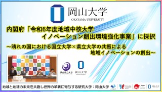 国立大学法人岡山大学(本部:岡山市北区、学長:那須保友)と岡山県立大学は2024年10月4日 、内閣府「令和6年度 地域中核大学イノベーション創出環境強化事業」に採択されました。