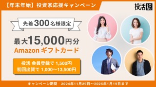 「2025年は新しく投資を始めたい !」そんな投資家を応援するため、投活では年末年始限定でキャンペーンをすることになりました。先着300名様限定で最大15,000円分のAmazonギフト券がもらえるキャンペーンとなり、2025年に向けてもっと投資をしたい方の後押しになりたいと考え、実施する運びとなりました。