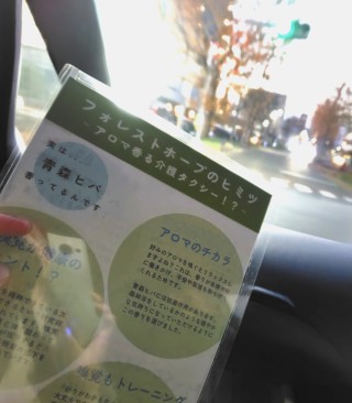 同タクシーでは、利用者と介護者双方にとって心地よい空間を提供するため、車内にヒバチップを設置し、青森ヒバのアロマオイルを垂らすことで森林浴のような演出をしています。