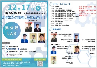 国立大学法人岡山大学(本部:岡山市北区、学長:那須保友)の研究・イノベーション共創機構スタートアップ・ベンチャー創出本部は、岡山大学起業部とともに、サイエンスに興味のある学生(文系理系問わず)、研究者、社会人、企業をつなぐイベント「異分野Lab」を、2024年12月17日(火) に本学津島キャンパスにある共育共創コモンズ(OUX)で開催します。