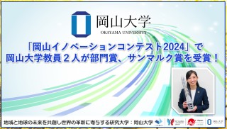革新的なビジネスプランや実践例を競う「岡山イノベーションコンテスト2024」の最終審査が2024年11月23日 に岡山芸術創造劇場ハレノワ(岡山市)で開催され、本学学術研究院ヘルスシステム統合科学学域の宮本愛助教がビジネスプラン部門/一般の部の「部門賞」に、学術研究院医歯薬学域(医)の内山淳平准教授が「サンマルク賞」に輝きました。
