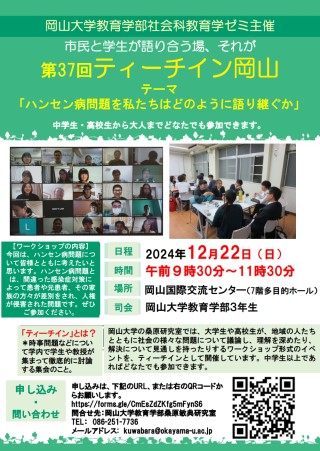 国立大学法人岡山大学(本部:岡山市北区、学長:那須保友)の岡山大学教育学部社会科教育学ゼミでは、2024年12月22日(日) に第37回ティーチイン岡山「ハンセン病問題を私たちはどのように語り継ぐか」を、岡山国際交流センター(7階多目的ホール)で開催します。