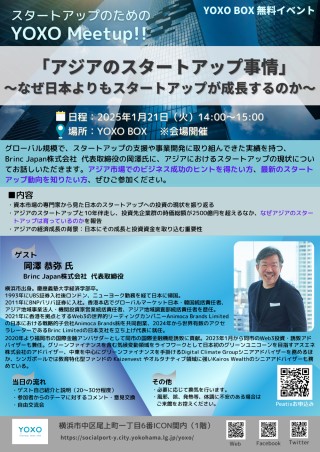 1月のMeetupは、グローバル規模で、スタートアップの支援や事業開発に取り組んできた実績を持つ、Brinc Japan株式会社 代表取締役の岡澤氏に、アジアにおけるスタートアップの現状についてお話しいただきます。アジア市場でのビジネス成功のヒントを得たい方、最新のスタートアップ動向を知りたい方、ぜひご参加ください。