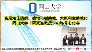 国立大学法人岡山大学(本部:岡山市北区、学長:那須保友)学術研究院医歯薬学域の髙尾知佳講師、同学域の大原利章助教、総合内科・総合診療科の德増一樹助教を研究准教授として選任し、2024年11月25日 に称号付与式を開催しました。付与式では、那須保友学長から認定証が手渡され、認定者らが自身の研究についておのおの紹介しました。