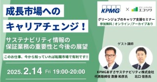 本セミナーでは、KPMGあずさサステナビリティ(株) 代表取締役斎藤 和彦様と北口 信吾様をゲスト講師に迎え、第三者保証業務の重要性やビジネスの構造や将来ビジョン、また、異業種や未経験から転職された方の活躍事例などもお話しいただきます。