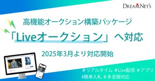 株式会社ドリームネッツ(本社:広島県福山市、代表取締役社長:井上 一成)は、自社で高機能オークションサイトを始められるオークション構築パッケージ(以下、本製品)において、 新たに「Liveオークション」の構築へ2025年3月3日(月) より対応開始いたします。
