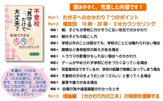 その疑問に対する私なりの答えが、サブタイトルの『家庭でできる10秒・30秒・3分カウンセリング』です。「見守る」ことを基本にしつつ、そこにカウンセリングに基づいた「小さな工夫」を加えたかかわりや働きかけを行っていくことをおすすめしたいのです。