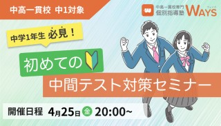 株式会社メイツ(本社:東京都新宿区、代表取締役:遠藤尚範)が運営する『中高一貫校専門 個別指導塾WAYS(以下、WAYS)』は、2025年4月25日(金) に中高一貫校に通う中学1年生とその保護者様を対象とした無料オンラインセミナー『初めての中間テスト対策セミナー』を開催いたします。