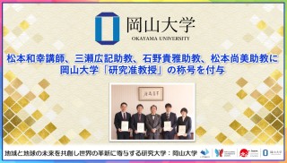 国立大学法人岡山大学(本部:岡山市北区、学長:那須保友)は、松本和幸講師、三瀬広記助教、石野貴雅助教、松本尚美助教に対し、「研究准教授」の称号を付与しました。2025年2月27日 に称号付与式を開催し、那須保友学長から認定証が手渡され、受賞者の各研究内容について紹介がありました。