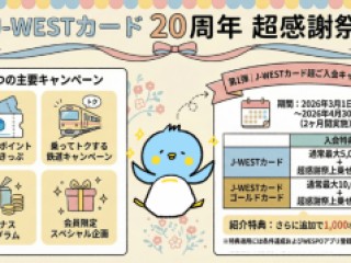 JR西日本の「J-WESTカード」が誕生20周年を迎えるのを記念して、2026年3月1日から1年間にわたる特別なイベント「20周年 超感謝祭」が実施されます。