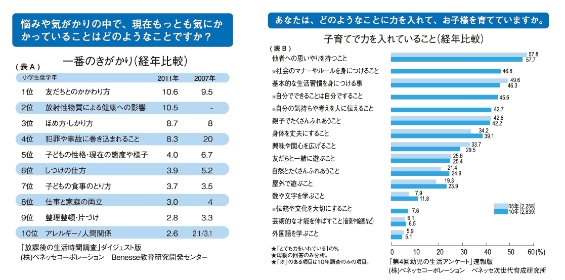 子育て中の親に対し、『悩みや気がかりの中で、現在最も気にかかっていることはどのようなことですか?』と調査を行ったところ、「友だちとのかかわり方」や「ほめ方・しかり方」が上位となりました。