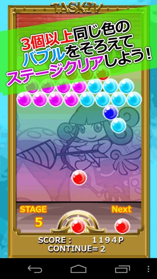 一個ずつバブルを投げ入れ、バブルの塊を落として、ステージをクリアせよ!