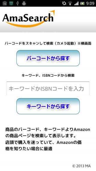 AmaSearchは商品に付けられたバーコードを端末に付いているカメラで撮影するかキーワードを入力することで大手ネットショッピングサイト「amazon」の商品ページへ簡単にアクセスすることが出来ます。