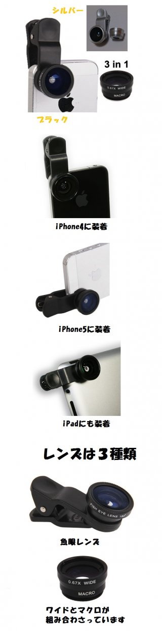 iPhone/iPad/スマホ用クリップ式カメラレンズ 魚眼/広角/マクロでエキサイティングな写真撮影を!!