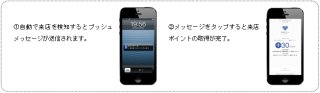 専用アプリの特徴は、顧客がインストールしたスマートフォンを手にして入店するだけで、自動的に「来店ポイント」を取得できる、これまでになかったサービスを実現している点です。
