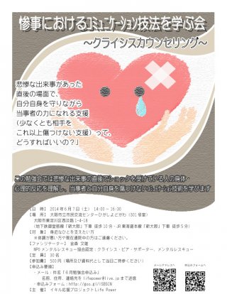 生きづらさを抱えた人の生きる力を応援するイキル応援プロジェクト Life Powerは、2014年6月7日(土) に、大阪市立市民交流センターひがしよどがわで、惨事に出会った人の身体的・心理的反応を理解し、具体的な支援法を学ぶ勉強会を開催します。