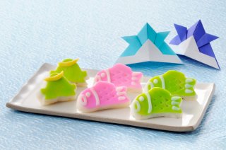 『端午の節句』は、モチーフとなる「かぶと」と「鯉のぼり」を伝統と技術の細工蒲鉾でかわいらしく表現しました。「かぶと」は男の子が喜ぶ伊達政宗の兜のデザインで三日月型をあしらいました。「鯛のぼり」は、赤と緑の2種類。鯉のぼりが風を含んで空をたなびく様をイメージして、かわいらしい表情にしました。お味はそれぞれえび、しそ、チーズ入り。