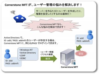 Active Directoryで管理されたユーザー情報やアクセス権限は、Cornerstone MFTに継承されるため、ユーザー管理の手間を削減できます。
