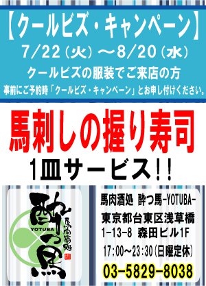 馬肉酒処 酔つ馬-YOTUBA-(所在地:東京都台東区浅草橋)では今夏、日頃ご愛顧いただいているお客様への感謝の気持ちを込めて、「クールビズ・キャンペーン」と銘打ち、2014年7月22日(火) より、クールビズの服装でご来店していただいたお客様(要予約)に「馬刺しの握り寿司」一組様一皿を無料でご提供するキャンペーンを展開いたします。