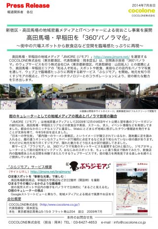高田馬場・早稲田の地域メディア「JIMORE (ジモア)」http://www.jimore.net/ を運営する COCOLONE株式会社(東京都港区、代表取締役:岡本匡弘)は、空間表示技術「360°パノラ マ」のウェブサービスを行う株式会社CIA(東京都新宿区、代表取締役:山田拓人)との提携によ り、高田馬場・早稲田エリアの「知る人ぞ知る」スポットや飲食、美容などの店内をパノラマ写真 を通して、ウェブ上で臨場感たっぷりに再現する新サービス「ぶらジモア」を開始。地元を知り尽 くすジモアの視点と、ITベンチャーのテクノロジーとのコラボレーションにより、街の新たな魅力 を引き出します。