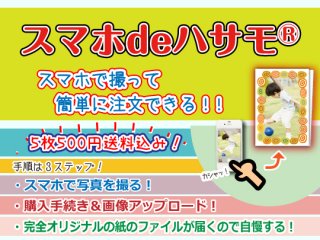 既存のハサモPC専用販売サイト(http://紙で伝える.jp/shop/)では主にテンプレートから選ぶ形をとっていましたが、今回新たに立ち上げたスマートフォン専用サイト「スマホdeハサモ」(http://紙で伝える.jp/shop/sumaho_hasamo/)ではスマートフォンから撮った写真をアップロードするだけでオリジナルの紙ファイルが誰でも簡単に注文できるようになりました。