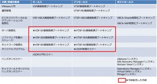 ネットワールドが従来から提供しているプログラムには、VMwareの初級資格である「VSP(VMware Sales Professional)」とVTSP(VMware Technical Solutions Professional)」を取得するための「VSP/VTSP資格取得ブートキャンプ」、そしてその上位資格である「運用管理」と「ビジネスクリティカルなアプリケーションの仮想化」分野の資格取得ブートキャンプ、ならびに、プリセールスSEを対象とした各種製品についての「ハンズオンセミナー」などがあります。そして今回、以下のプログラムを追加しました。