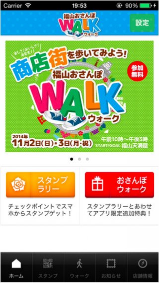 「おさんぽウォーク」は、来る11月2日(日) 、3日(祝)に広島県福山市の商店街で行われる「福山おさんぽウォーク」(webサイト:http://www.fukuyama-osanpo.com)のイベントに採用されました。