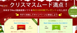 Digiarty社がMacXクリスマスプレゼントキャンペーンを開催しており、オールインワン動画変換ソフトMacX Video Converter Proを無料配布し、毎日当たる1000個プレゼントいたします。Youtubeからクリスマス映画や好きな曲をダウンロード;クリスマスの記念写真でステキなスライドショーを作成、旅行中撮影した思い出が溢れるカメラ映像をiPhone iPad Androidデバイスに再生等とMacX Video Converter Proが全部対応可能!それと同時に、人気ソフトMacX DVD Ripper Pro、MacX 2014クリスマスのギフトセットなども最大70%の割引で提供しています。キャンペーンの実施時間は今から今から12月31日(水) までです。ぜひ見逃せないでください。