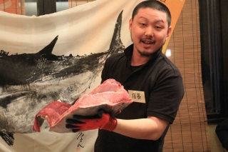 2015年2月17日(火) 19:00~大阪なんばにあるひといき~一粋~難波店で市場やイベントのまぐろ解体ショーとはひと味違う、ビールが無料で捌いた部位をその場でもらえる全員参加型のマグロ解体ショーがスタート。