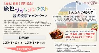 2014年11月 に創刊7周年を迎えた「旅色」と株式会社JTBの発行する「カード型旅行券 JTBトラベルギフト」とのタイアップ企画として、2015年1月26日 からスタートした「旅色創刊7周年記念!旅色フォトコンテスト」では、日本の旅で出会った印象的な“色”を収めた「とっておきの風景写真」を募集し、プロ写真家の撮影したような美しい景色から、心温まる旅の風景まで全国各地から約3,000点もの応募をいただきました。
