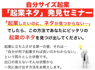 起業ネタ発見セミナーでは、自分にピッタリの「起業ネタ」「起業アイデア」を見つけ出す方法をお教えします。