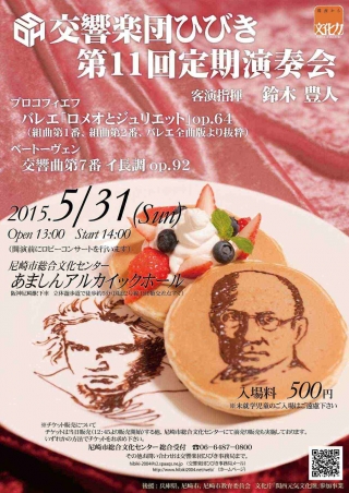 阪神間で活動する「交響楽団ひびき」(こうきょうがくだんひびき)は、平成27年5月31日(日) にあましんアルカイックホール(兵庫県尼崎市昭和通2-7-16)にて、第11回定期演奏会を開催致します。演目は