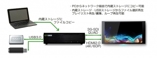 今回発表する「4K UHD XJive PRO SDIモデル」は、シリーズ最上位モデルとして、従来のHDMI(High-Definition Multimedia Interface,最大4K/60p 10bit)出力に加えて、3G-SDI(Serial Digital Interface) 4K QUAD出力が可能なため、HDMI対応の民生4Kテレビやモニターだけでなく、SDI対応の業務用ディスプレイでの4Kコンテンツ再生が可能となります。