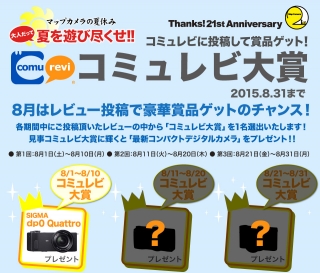 シュッピン株式会社(本社:東京都新宿区、代表取締役社長:鈴木 慶、東証マザーズ:証券コード3179)の運営するカメラ専門店『Map Camera』では、カメラ機材のレビューを投稿すると、毎回抽選で1名様に最新デジカメをプレゼントする「コミュレビ大賞」を8月1日 〜8月31日 まで開催します。