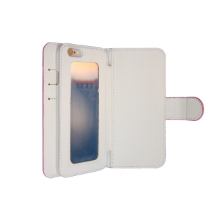 身だしなみのチェックなど外出先で必要な時に直ぐに使える便利なミラーがケース背面部に収納された手帳型ケースです。