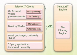 SelectorITのエンジンは、ローカル、リモートにインストールできる。SelectorITのクライエントには、インタラクティブ、自動的フィルタリングを可能にする数種類の標準クライエントがある。Microsoft Exchange、Microsoft Outlook等のEメール、Webサービス等、第3パーティのクライエントは、API経由で接続される。