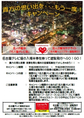県営名古屋空港にて航空事業を行う 株式会社セコ・インターナショナル(本社:名古屋市 / 代表取締役皆川正浩)は、名古屋テレビ塔とのコラボレーションにて「貴方の思い出を・・・もう一度キャンペーン」を実施致します。