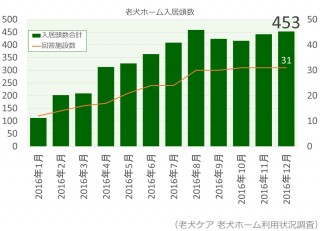 ◎2016年12月 末時点の老犬ホーム入居頭数は453頭