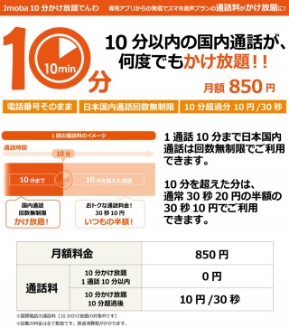 大手携帯電話会社の「かけ放題」や、格安SIM会社の「5分定額かけ放題」など、通話定額サービスのご利用が増えている中、「J-mobile」では30秒10円の「Jmobaでんわ」に加え、さらに低料金で安心して通話を楽しんでいただけるよう、「10分かけ放題」のオプションサービスの提供を開始することとしました。