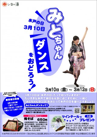 スーパー銭湯いちの湯水戸店(茨城県水戸市)では、3月10日 の「水戸の日」を記念するイベント「みとちゃんダンスをおどろう!」を2017年3月10日(金) ~12日(日)の3日間に渡って開催いたします。