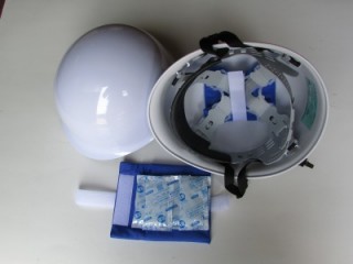 当商品は、標準的な作業用ヘルメットの内側頭頂部にある樹脂製の「ハンモック」とヘルメット本体の空間に、小型の保冷剤を装着・固定し、頭部を適度に冷やすことができるものです。
