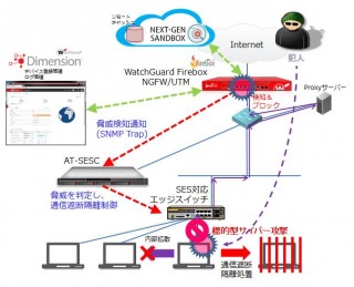 アライドテレシスのSESは、SDN技術をエンタープライズ市場に適応させ、企業向けアプリケーションとネットワークを連携/連動させることにより、ネットワーク運用管理にかかる工数/コストの削減、およびセキュリティの強化を実現します。SESはすでにIT資産管理システム、ネットワーク脅威検知システムと連携しておりますが、このたび、プロキシ経由構成においても、クライアントの送信元IPアドレスを特定通知することができるFireboxシリーズ(Fireware OS 11.12 以降)との連携により、次世代ファイアウォール機能であるウイルス対策(GatewayAntiVirus)、レピュテーションセキュリティ(Reputation Enabled Defense)、URLフィルタリング(Web Blocker)、標的型攻撃対策(APT Blocker)等で検出した感染端末の通信をエッジスイッチにて遮断・隔離し、拡散防止するといった情報漏洩ソリューションを提供いたします。