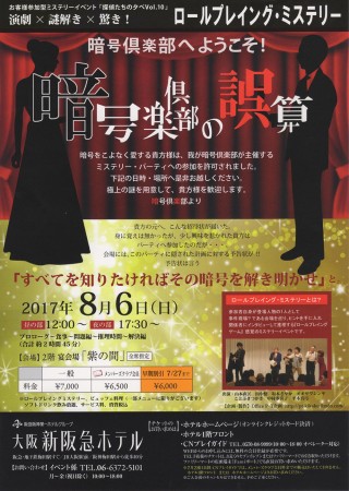 Office P・T企画(代表・和泉めぐみ)が2017年8月6日(日) に主催・大阪新阪急ホテル(大阪市・北区)、会場同ホテル紫の間でロールプレイング・ミステリー『暗号倶楽部の誤算』を上演します。