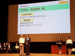『サプライヤー表彰』は、パイオニアの商品開発に大きく貢献した企業を表彰するものです。今回の表彰は、技術認証業務において、アリオンの持つ豊かな知見と幅広い提案によって新製品開発の品質向上および費用低減・日程厳守に貢献したことと、OEM製品向け接続検証業務において、グローバルでの現地対応により業務効率化に貢献したことが認められた結果となります。