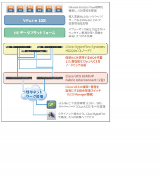 「Cisco HyperFlex」には複数の構成パターンが用意されていますが、今回のプロジェクトでは「Cisco UCS 6248UP Fabric Interconnect」、および「Cisco UCS C220M4」をベースとする「HX220c」を採用。Cisco Unified Computing System(Cisco UCS) 3ノードの構成で環境を構築しています。ノード増設も容易に行えるので今後の拡張ニーズにも柔軟に対応できます。
