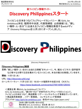 フィリピンと日本をつなぐフェアトレードカンパニー:株)Girls, be Ambitious(本社:福岡市中央区、代表取締役 山田麻樹)は、“新しい場所・人・自分”に出会えるフィリピン情報を発信するwebメディア:Disovery Philippinesを11月1日 にオープンしました。