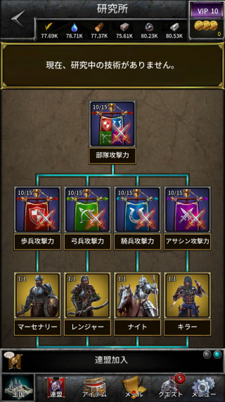 ・部隊の技術:部隊の攻撃力・防御力・ライフの強化、訓練できる兵科の種類解放