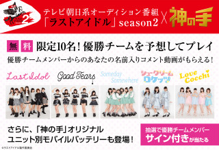 株式会社ブランジスタゲーム(本社:東京都渋谷区、代表取締役社長:木村泰宗)が運営する、3Dクレーンゲーム「神の手」は、テレビ朝日系列で放送中のオーディション番組「ラストアイドル」シーズン2とのコラボ企画を開始いたしました。