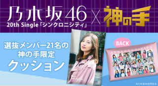 「神の手」では、乃木坂46 20枚目のシングル「シンクロニシティ」の発売を記念したコラボ企画を開始いたしました。当シングルは、ミュージックビデオの再生回数が1,000万回を超え、発売前にもかかわらず有線J-POPリクエストチャート1位を獲得、更には発売初週で100万枚超の売上を達成している節目にふさわしい話題曲です。当企画のコラボ景品は、選抜メンバー21名それぞれの「神の手」限定クッションに決定いたしました。当シングルの可愛いキービジュアルのメンバーがデザインされた「神の手」でなければ手に入れることができない、乃木坂46グッズが実現しました。今回も数量限定のため、お早めに!その他、当企画に関する詳細は「神の手」アプリ・公式サイトなどでご確認ください。