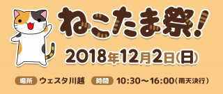 ねこフェス埼⽟(本社︓埼⽟県所沢市、代表︓程原 宏明)は、「ねこたま祭︕(ねこたまさ い)」を2018年12⽉2⽇(⽇)に埼⽟・ウェスタ川越にて開催いたします。「ねこたま祭︕」 は、ねこを中⼼に、いぬ、とり、ウサギ、ハムスター、フェレット、ハリネズミ等すべての 動物を愛する⽅のための展⽰即売会です。